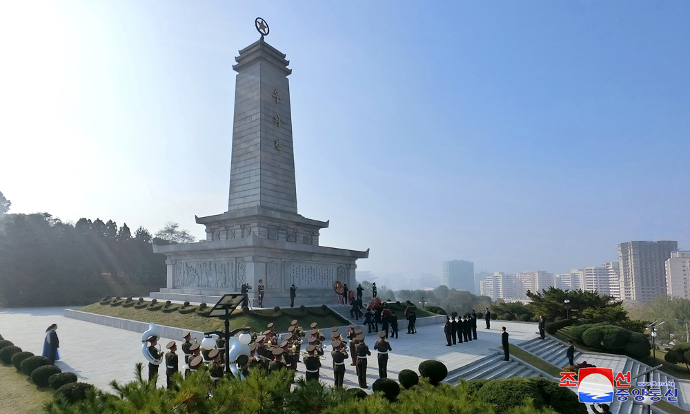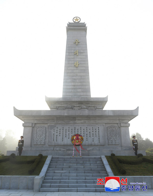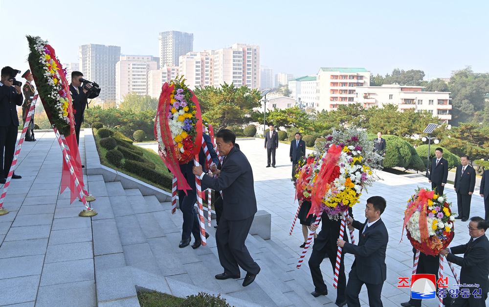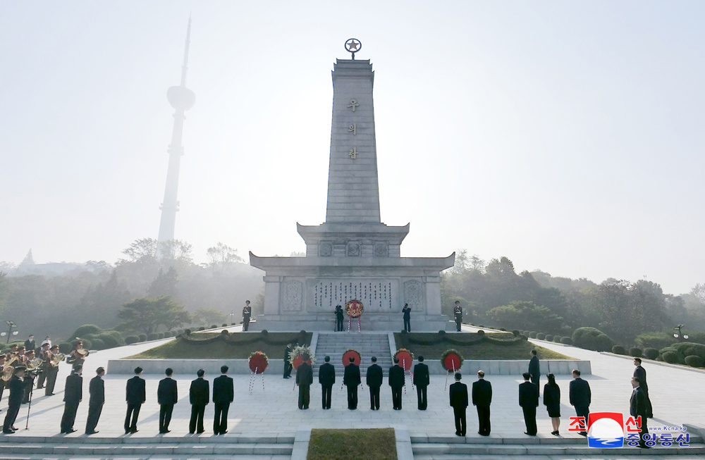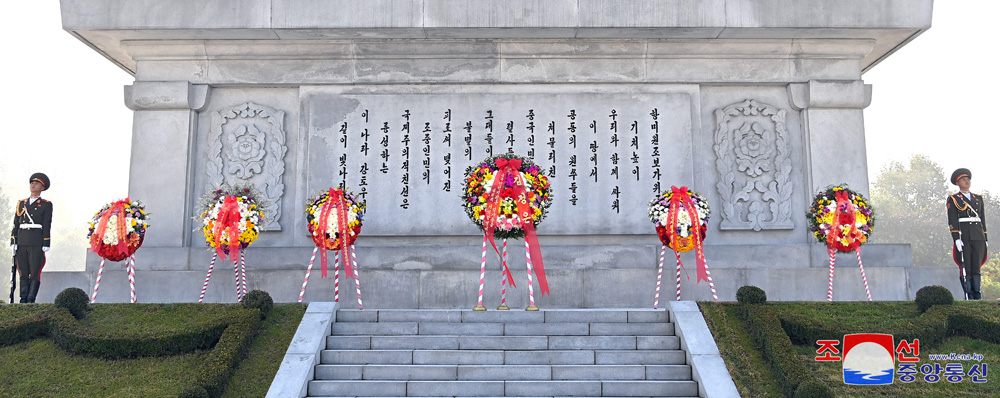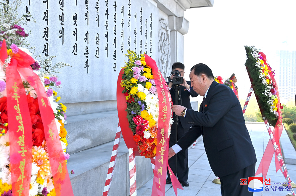 중국인민지원군 조선전선참전 74돐에 즈음하여 우리 나라 주재 중화인민공화국 특명전권대사와 대사관 성원들이 25일 우의탑에 화환을 진정하였다.