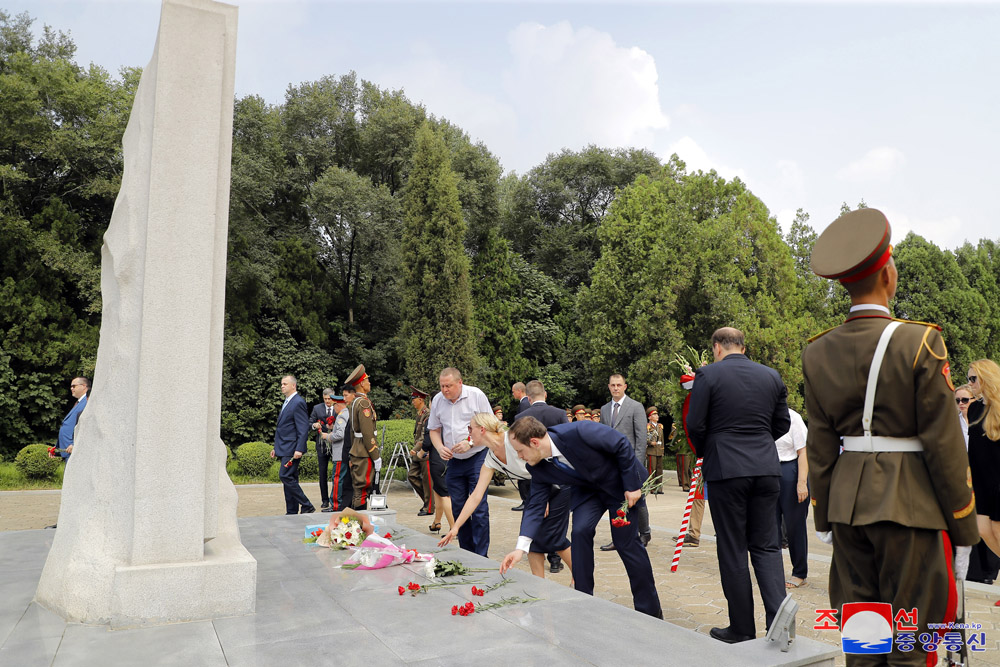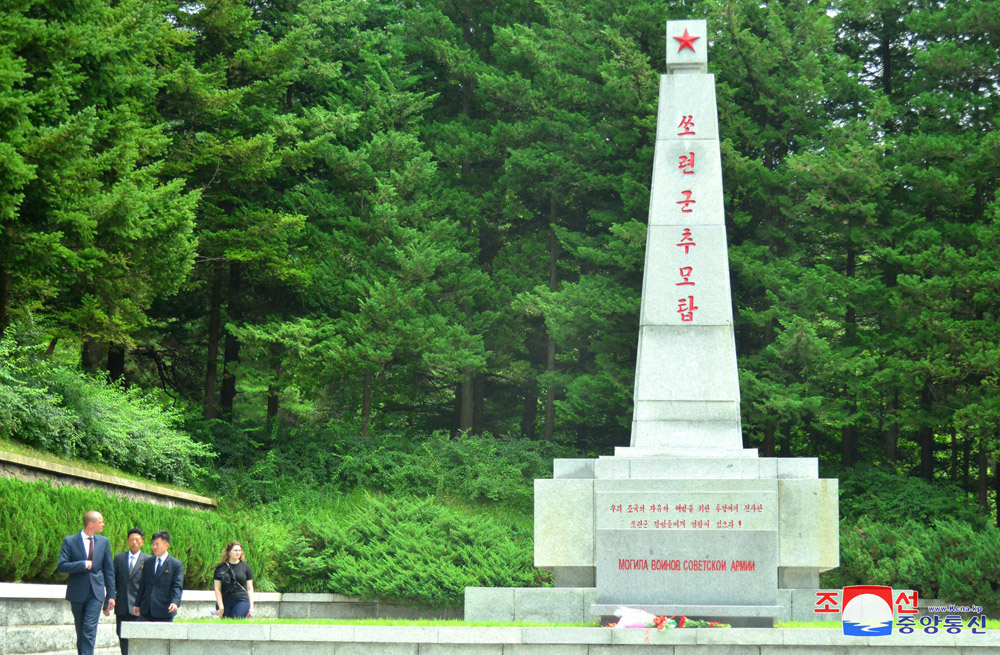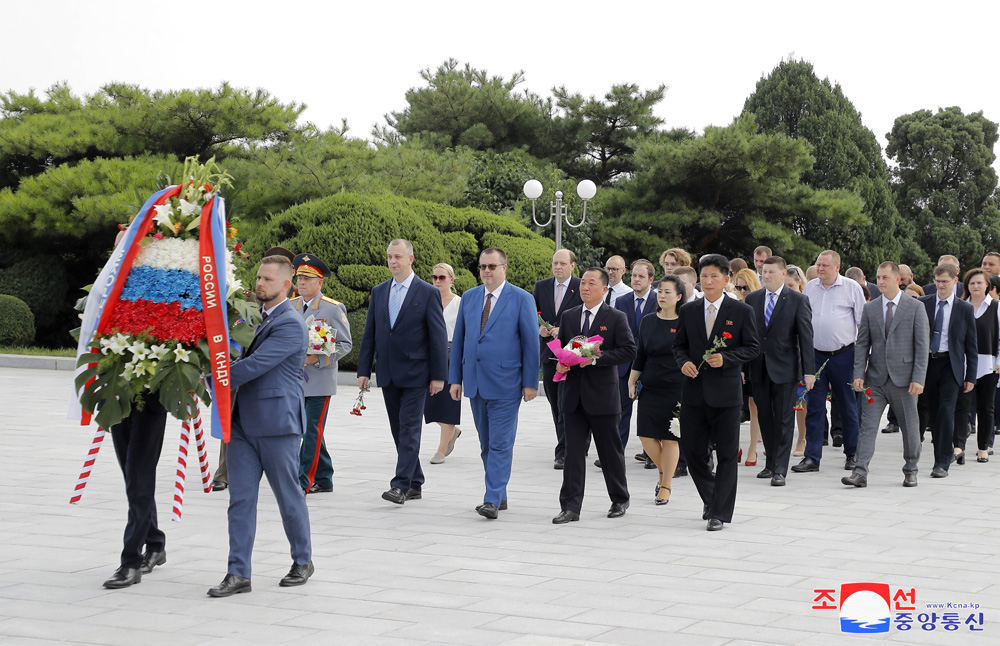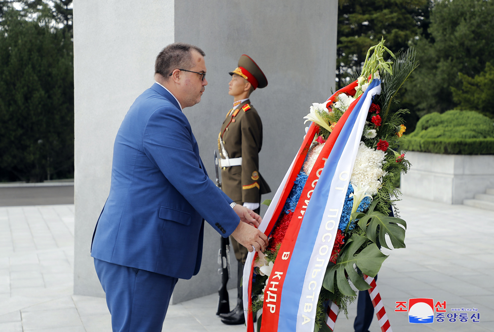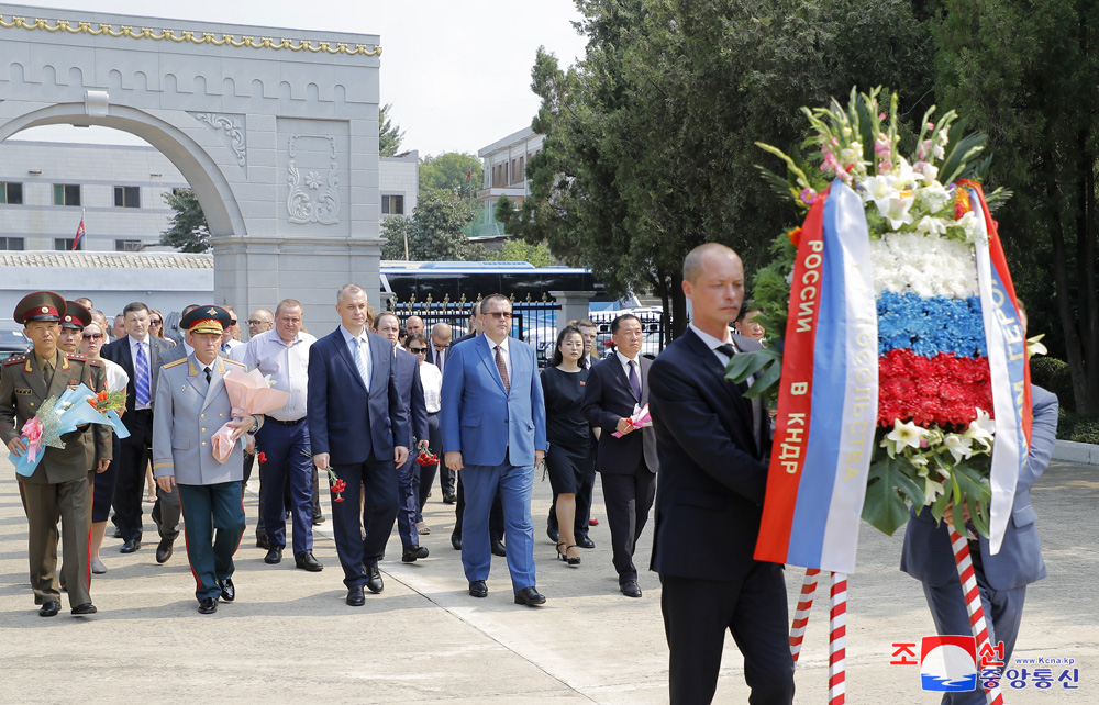 조국해방 79돐에 즈음하여 우리 나라 주재 로씨야련방대사관 성원들이 15일 해방탑에 화환을 진정하였다.