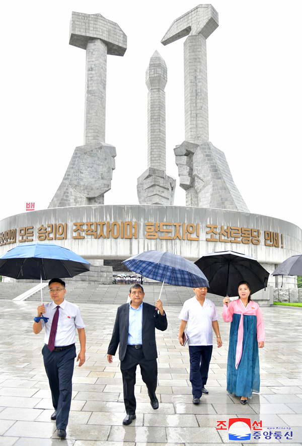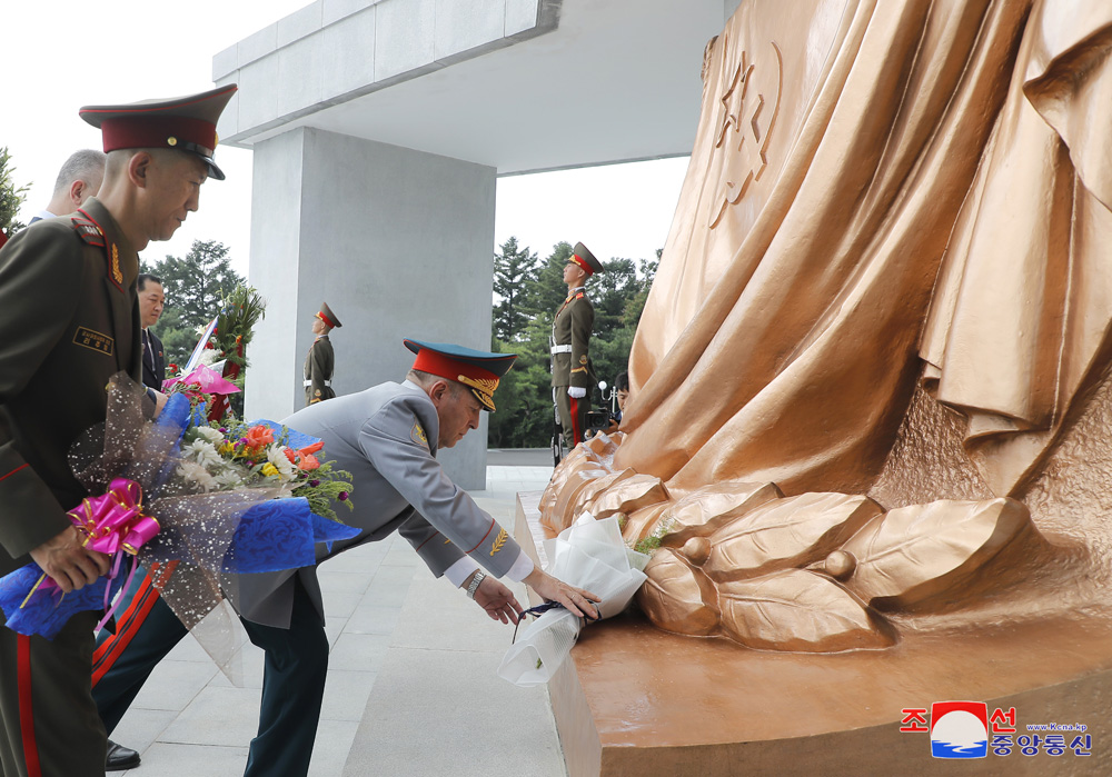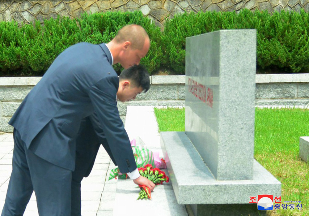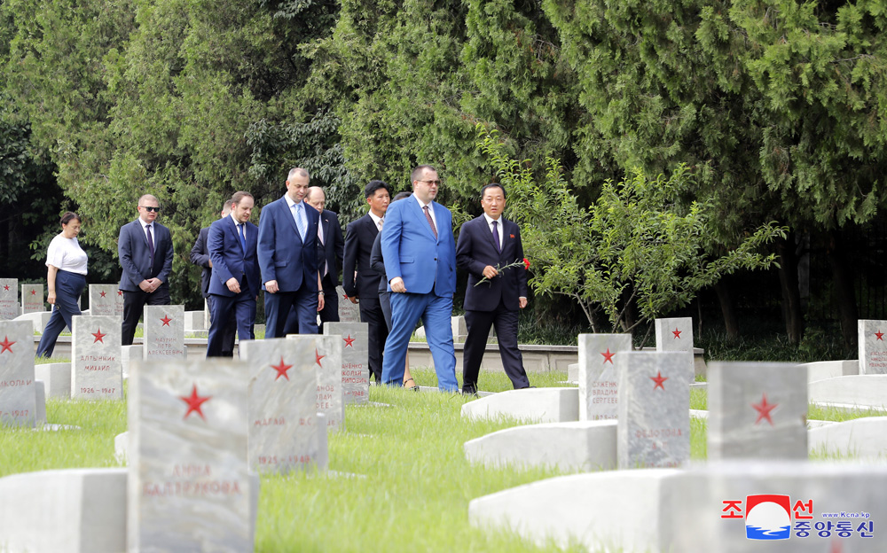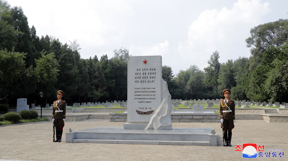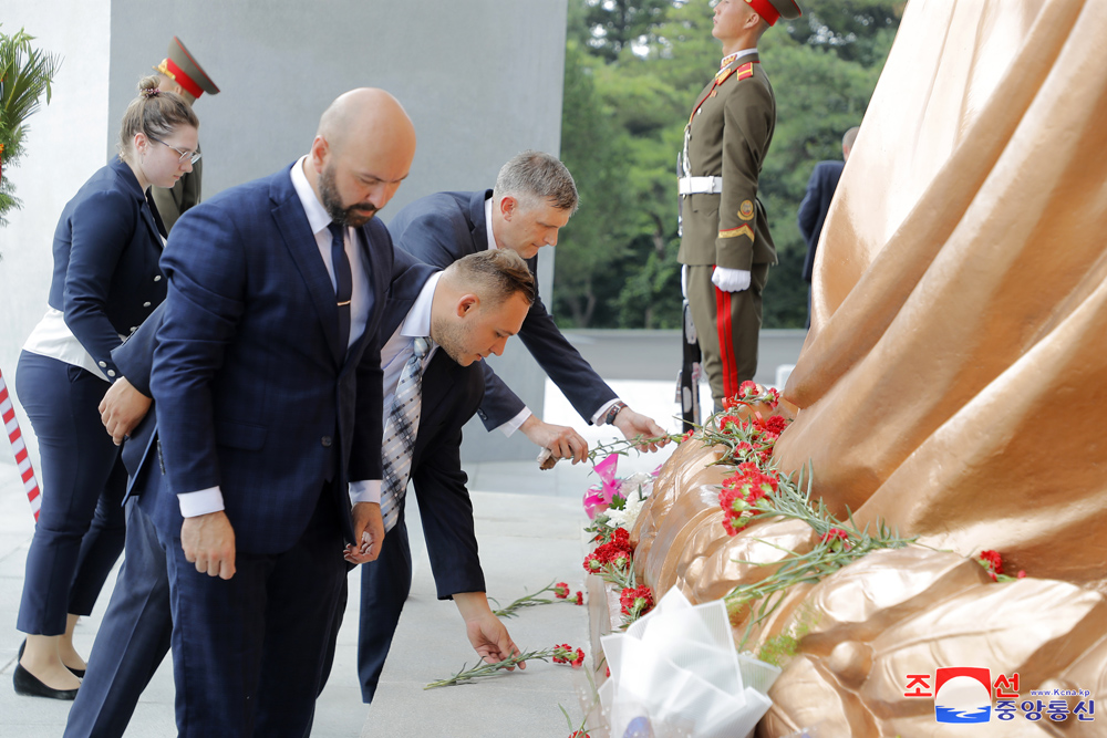 조국해방 79돐에 즈음하여 우리 나라 주재 로씨야련방대사관 성원들이 15일 해방탑에 화환을 진정하였다.