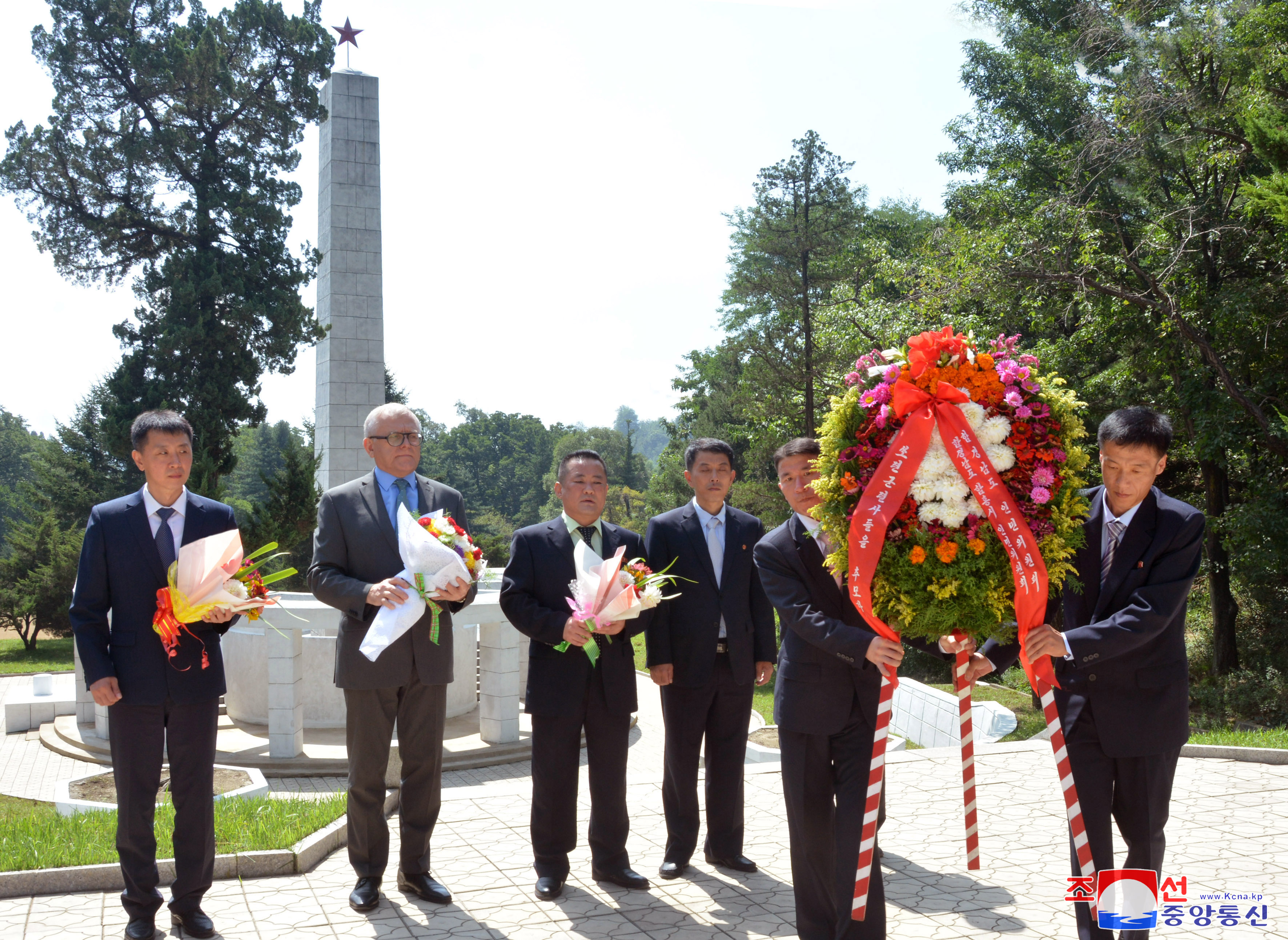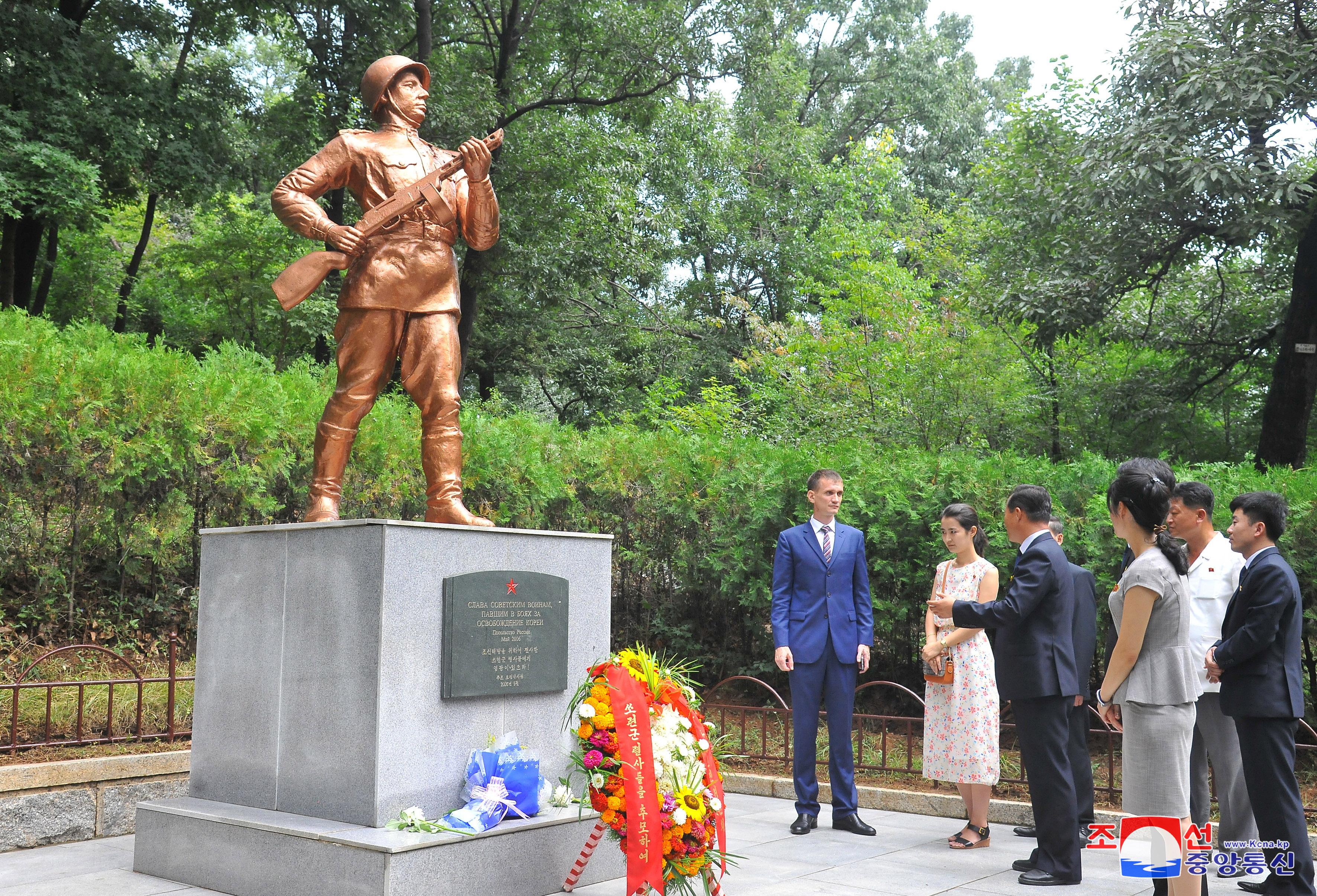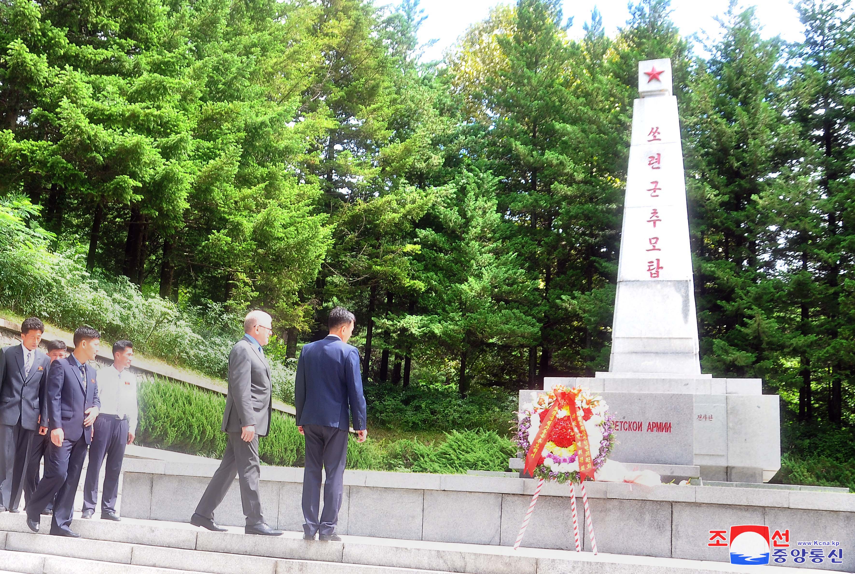 외무성, 지방정권기관 일군들과 우리 나라 주재 로씨야련방 특명전권대사를 비롯한 대사관 성원들, 체류중 로씨야손님들이 화환진정에 참가하였다.