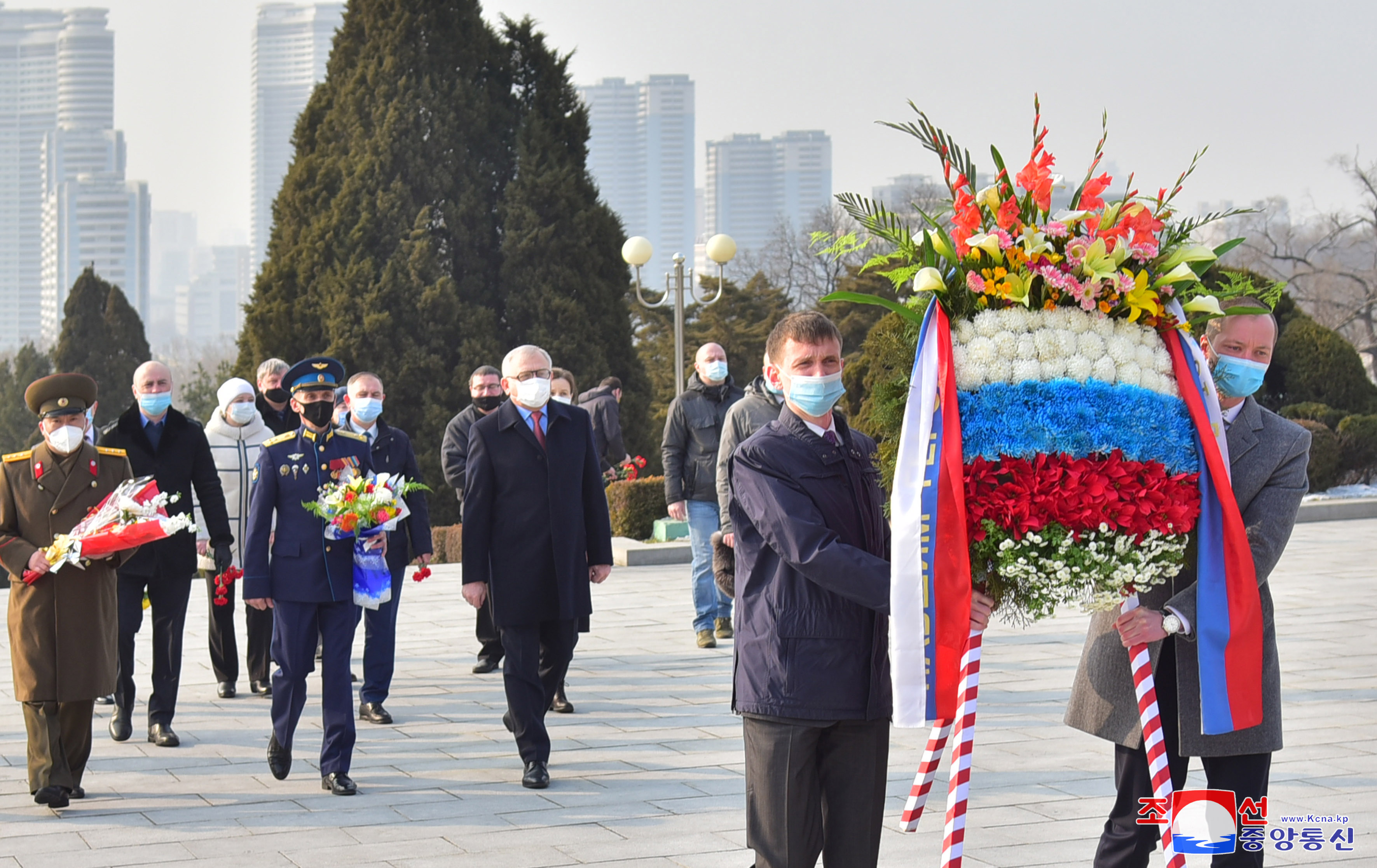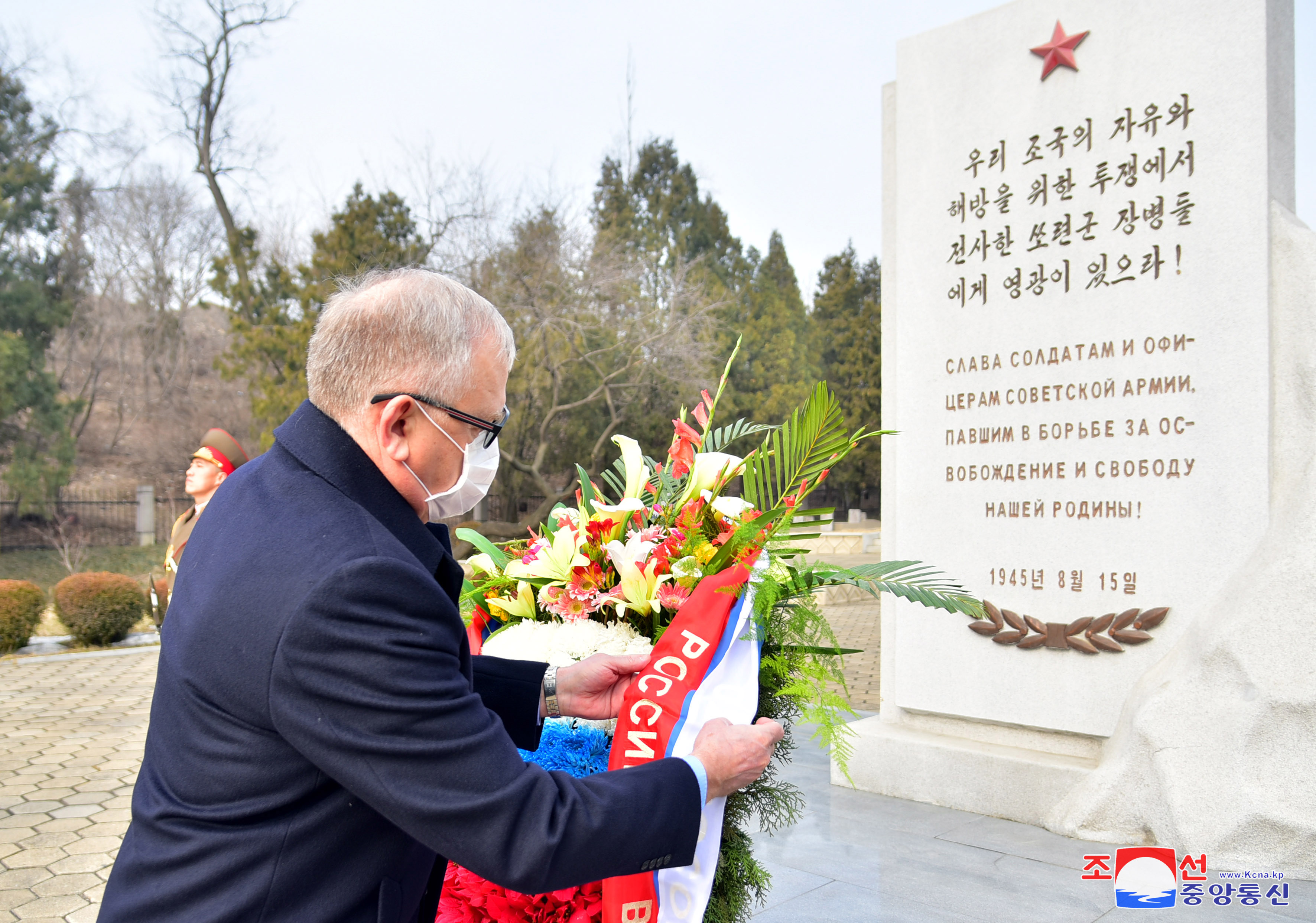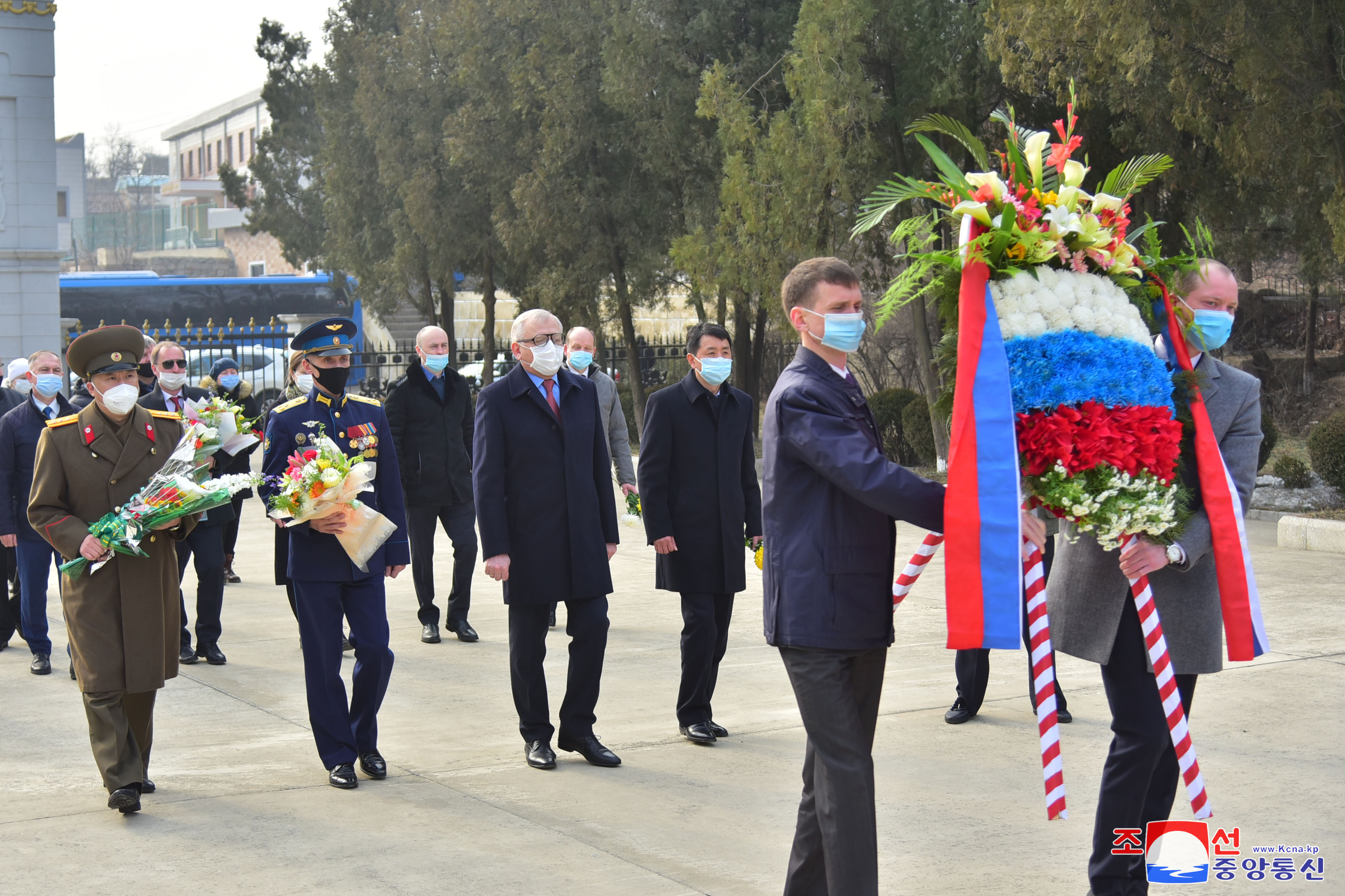 조국수호자의 날에 즈음하여 우리 나라 주재 로씨야련방대사관 성원들이 23일 해방탑에 화환을 진정하였다.