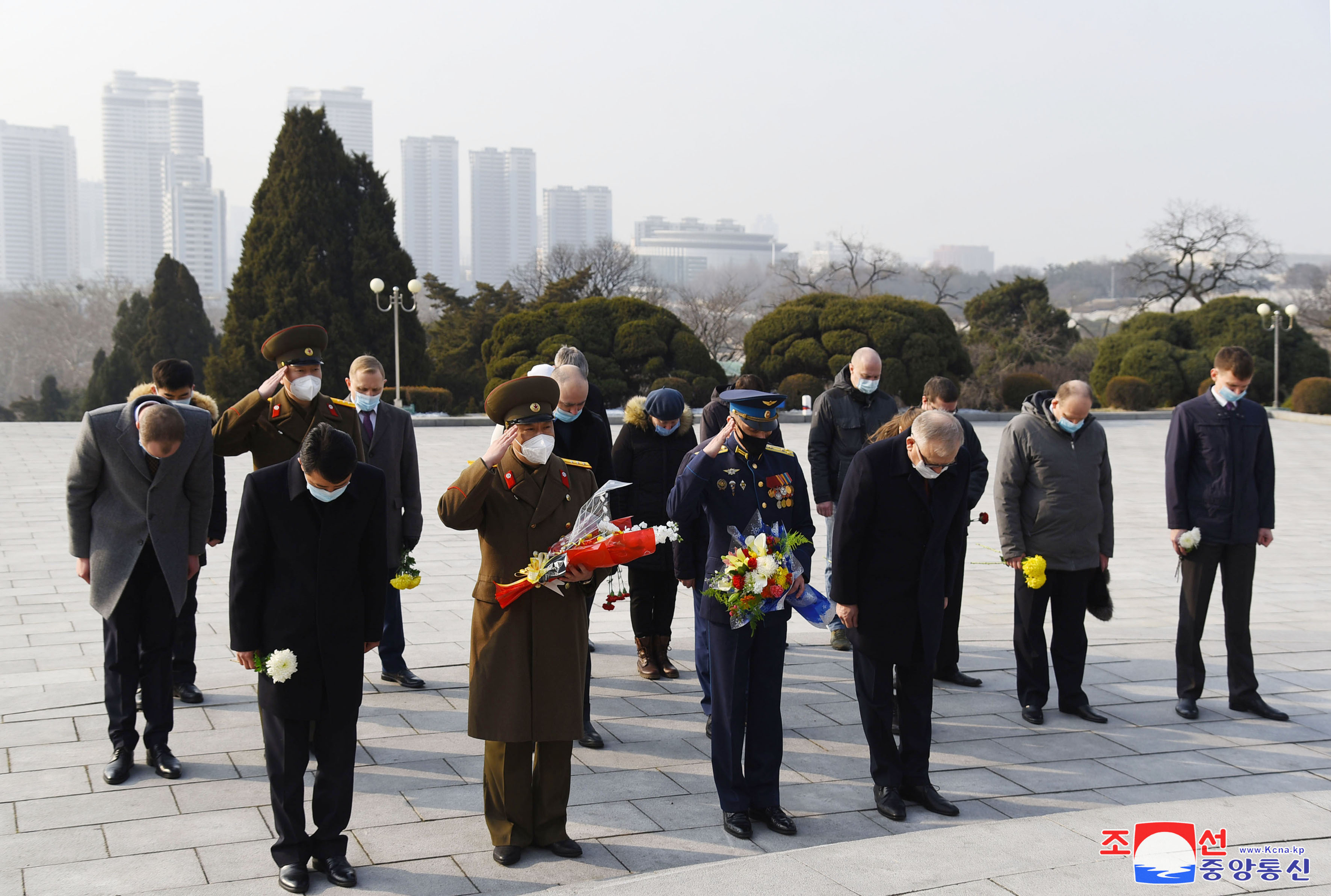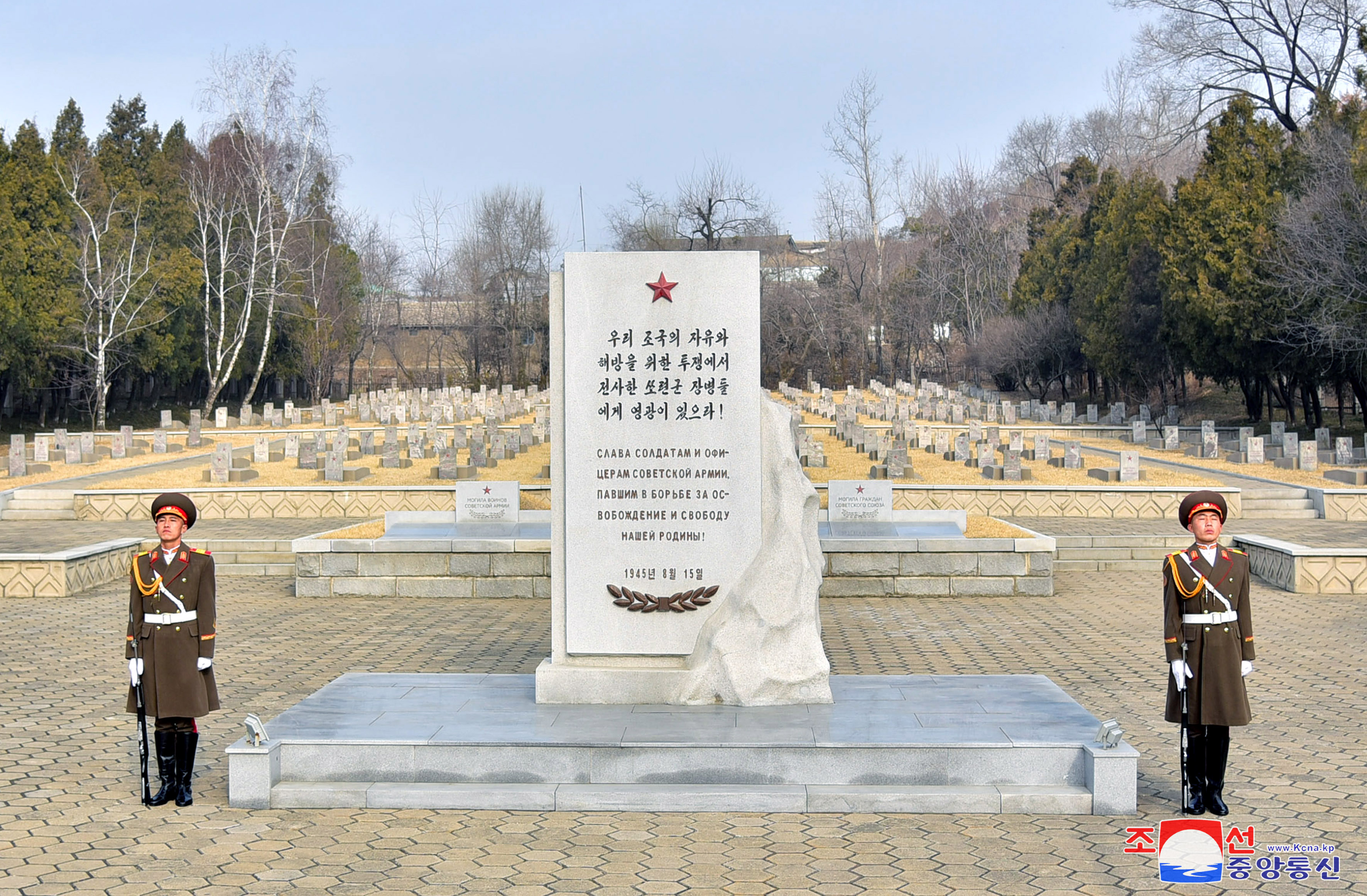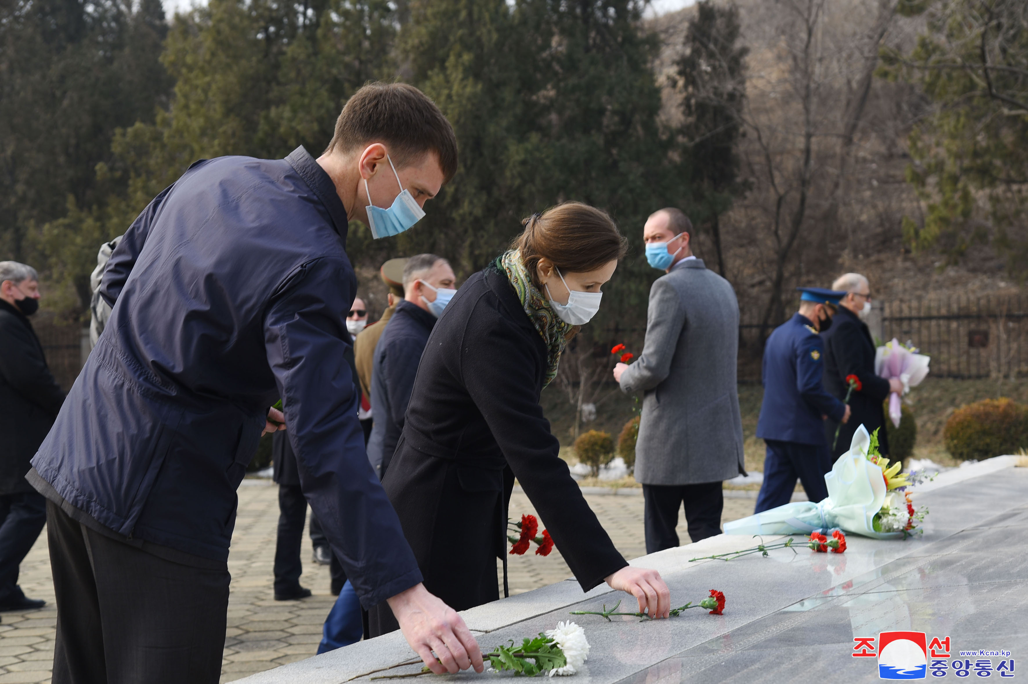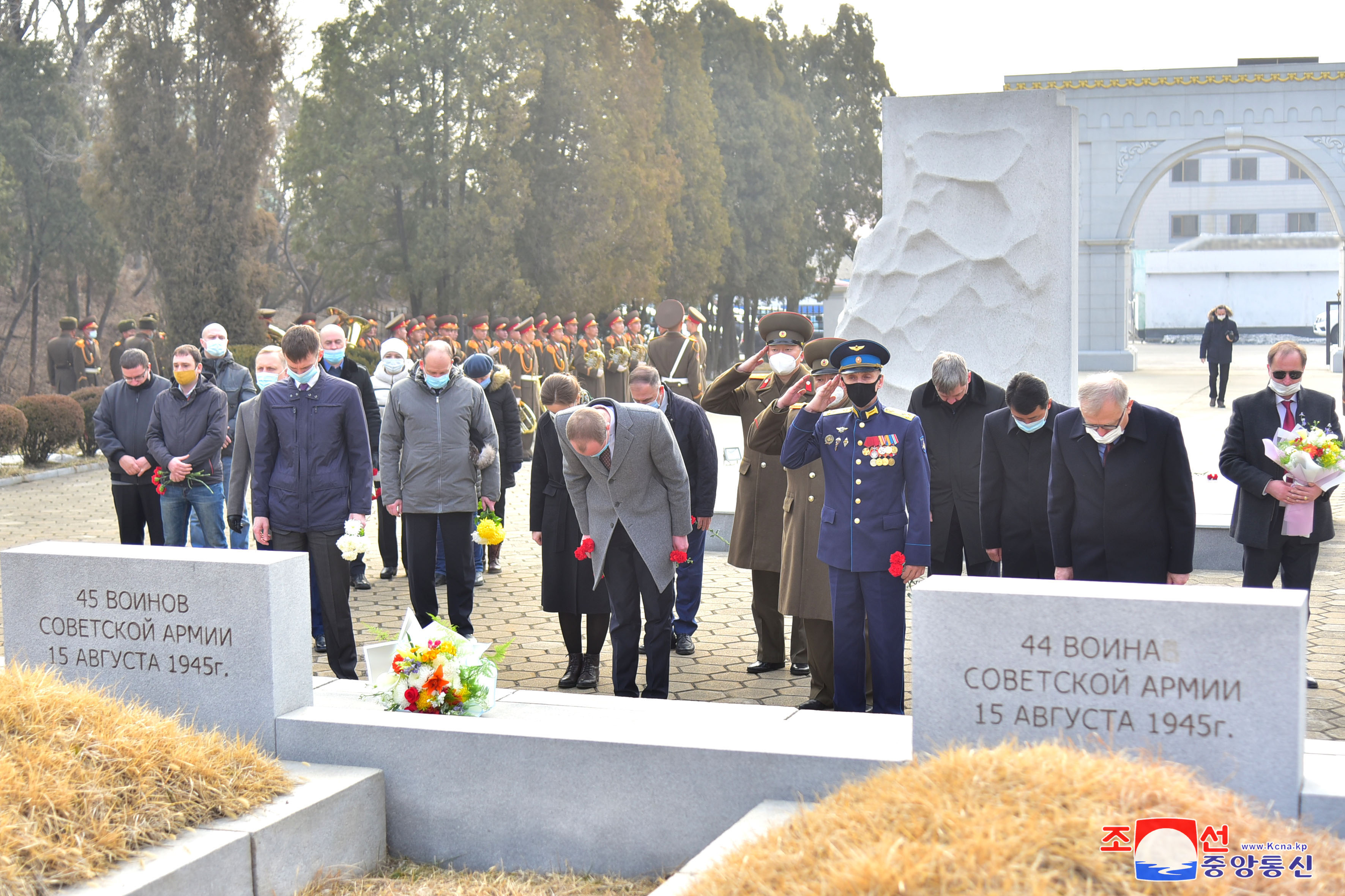 조국수호자의 날에 즈음하여 우리 나라 주재 로씨야련방대사관 성원들이 23일 해방탑에 화환을 진정하였다.