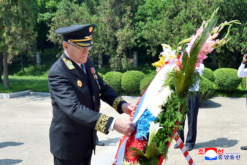 국경절에 즈음하여 우리 나라 주재 로씨야련방 특명전권대사 알렉싼드르 마쩨고라동지를 비롯한 로씨야대사관 성원들이 12일 해방탑에 화환을 진정하였다.