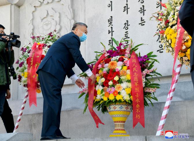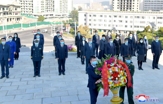 중국인민지원군 조선전선참전 71돐에 즈음하여 우리 나라 주재 중화인민공화국대사관 성원들이 25일 우의탑에 꽃바구니를 진정하였다.