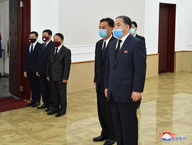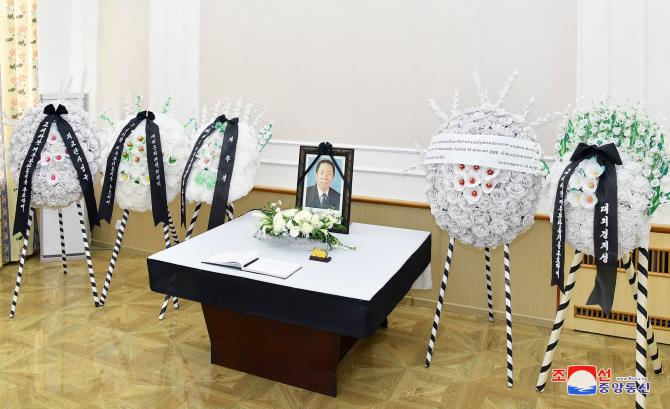 외무성, 대외경제성, 대외문화련락위원회, 외교단사업국의 명의로 된 화환들이 고인의 사진앞에 진정되였다.