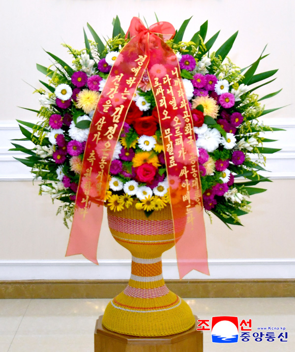 꽃바구니를 우리 나라 주재 니까라과공화국 특명전권대사가 4일 해당 부문 일군에게 전달하였다.(끝)