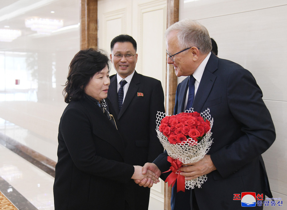 평양국제비행장에서 외무성 부상 김정규동지와 우리 나라 주재 로씨야련방 특명전권대사 알렉싼드르 마쩨고라동지가 마중하였다.(끝)