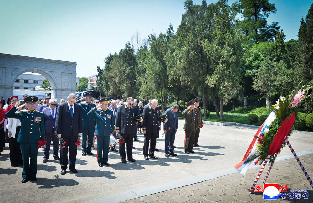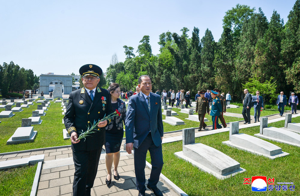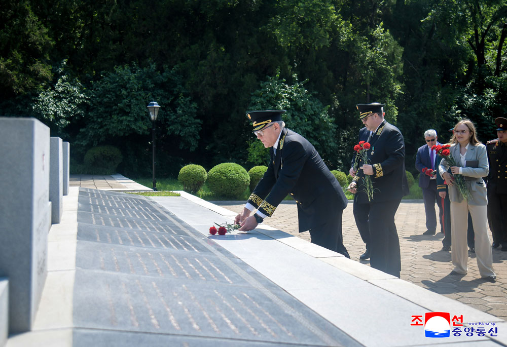 국경절에 즈음하여 우리 나라 주재 로씨야련방 특명전권대사 알렉싼드르 마쩨고라동지를 비롯한 로씨야대사관 성원들이 12일 해방탑에 화환을 진정하였다.