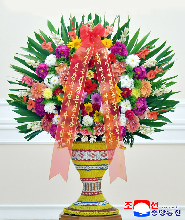 꽃바구니를 우리 나라 주재 라오스인민민주주의공화국 특명전권대사가 4일 해당 부문 일군에게 전달하였다.(끝)